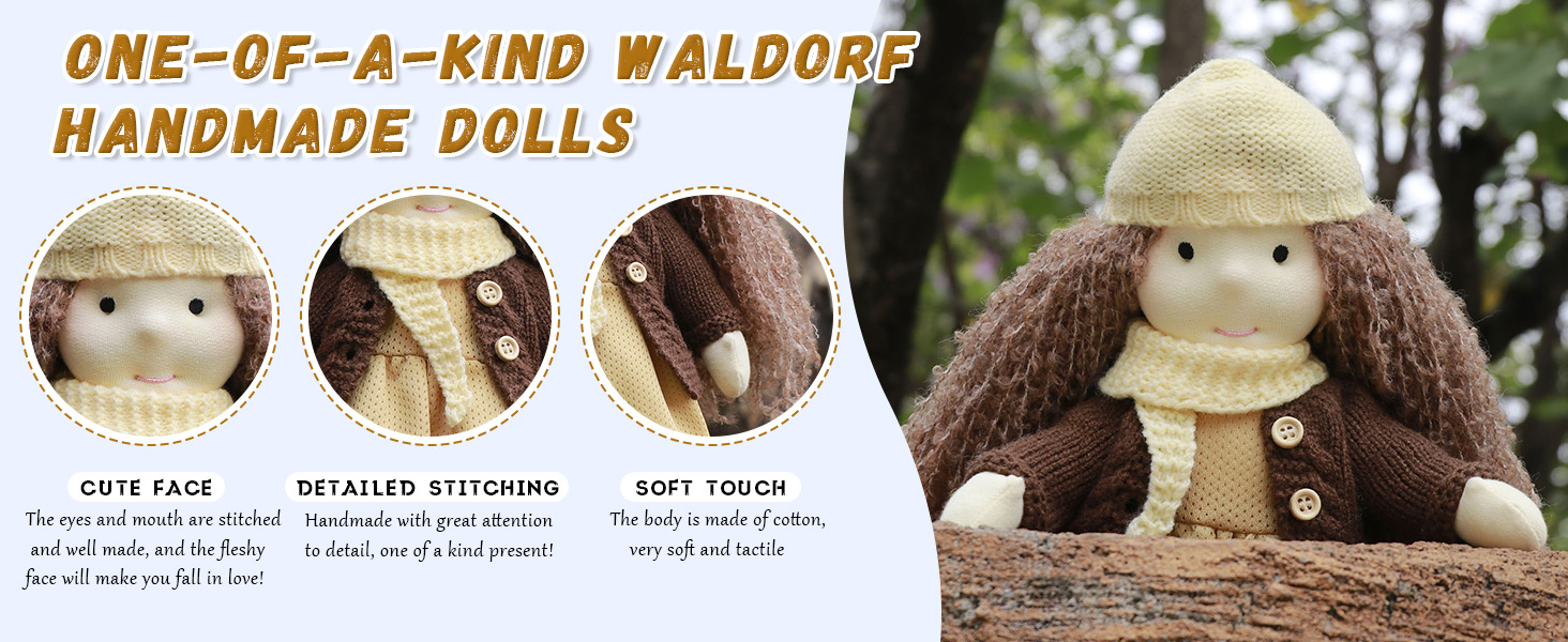 Waldorf dolls are typically made from natural materials such as cotton, wool, and wood, and are designed to have minimal facial features, allowing children to use their own imagination during play.