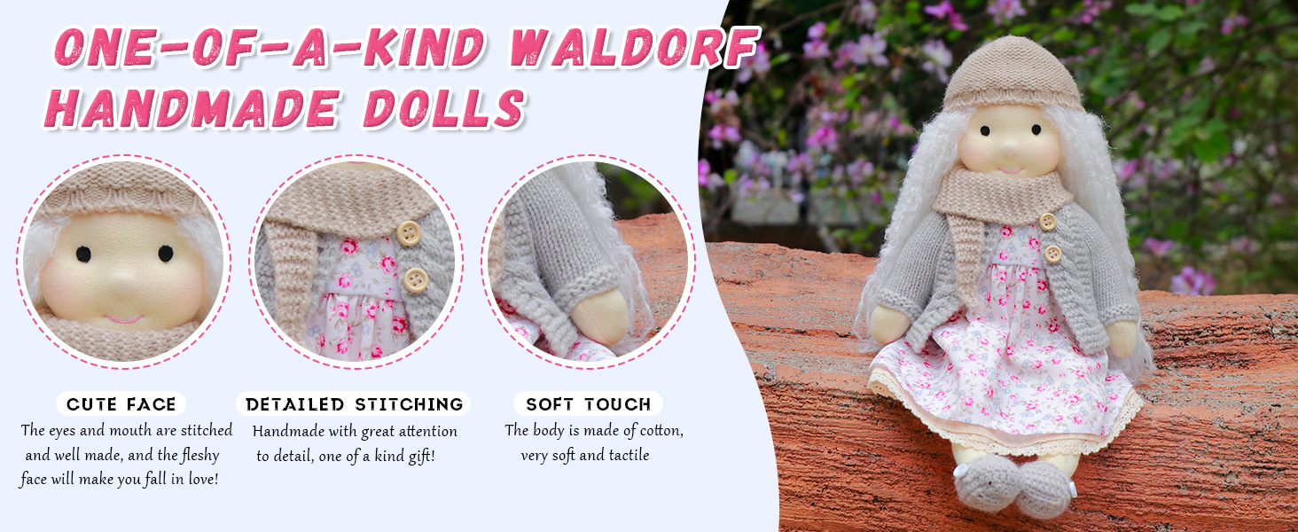 Waldorf dolls are typically made from natural materials such as cotton, wool, and wood, and are designed to have minimal facial features, allowing children to use their own imagination during play.