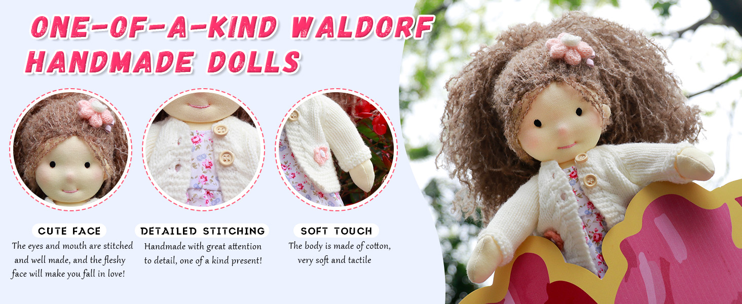Waldorf dolls are typically made from natural materials such as cotton, wool, and wood, and are designed to have minimal facial features, allowing children to use their own imagination during play.