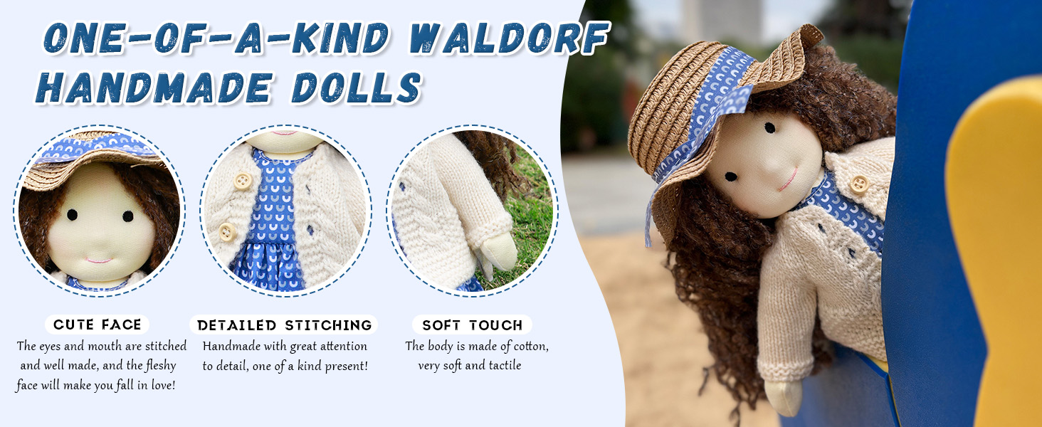 Waldorf dolls are typically made from natural materials such as cotton, wool, and wood, and are designed to have minimal facial features, allowing children to use their own imagination during play.