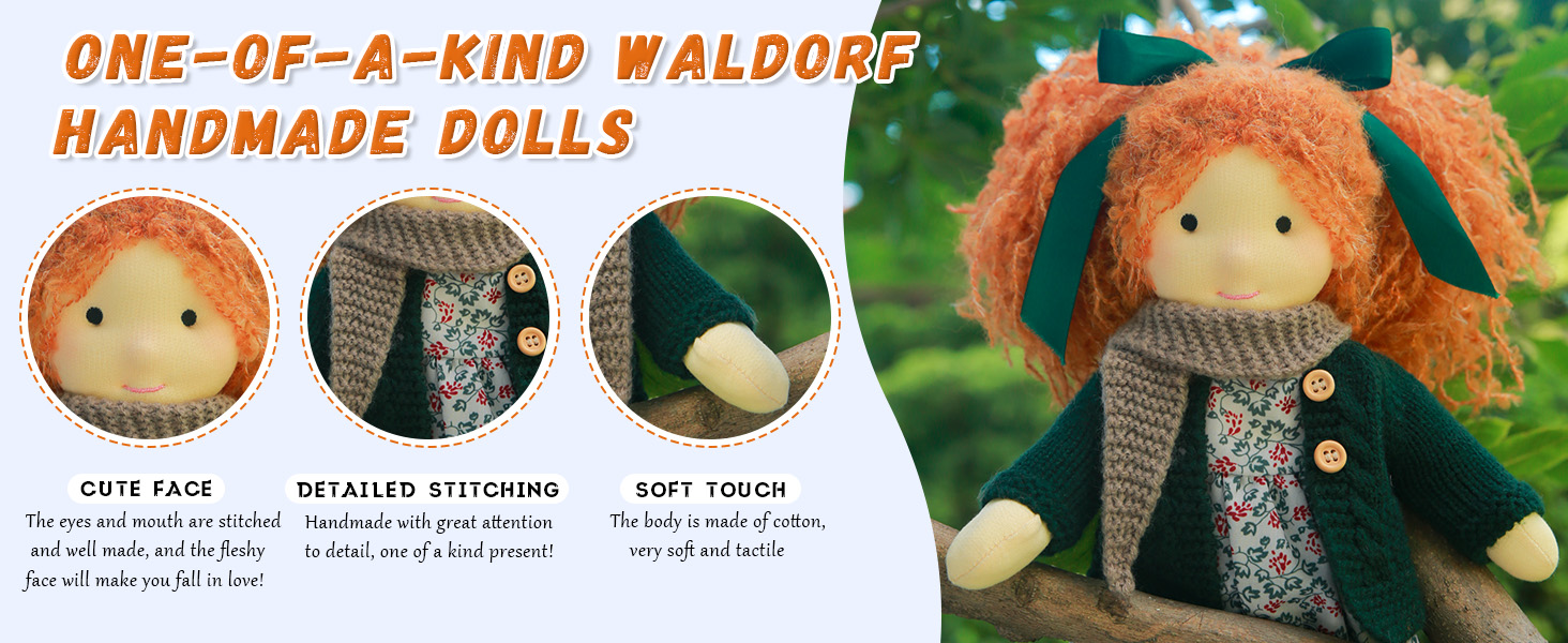 Waldorf dolls are typically made from natural materials such as cotton, wool, and wood, and are designed to have minimal facial features, allowing children to use their own imagination during play.