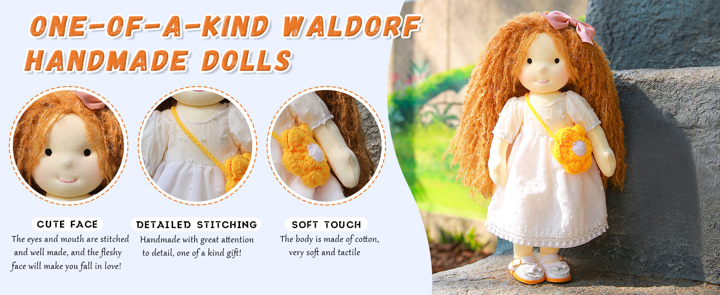 Waldorf dolls are typically made from natural materials such as cotton, wool, and wood, and are designed to have minimal facial features, allowing children to use their own imagination during play.