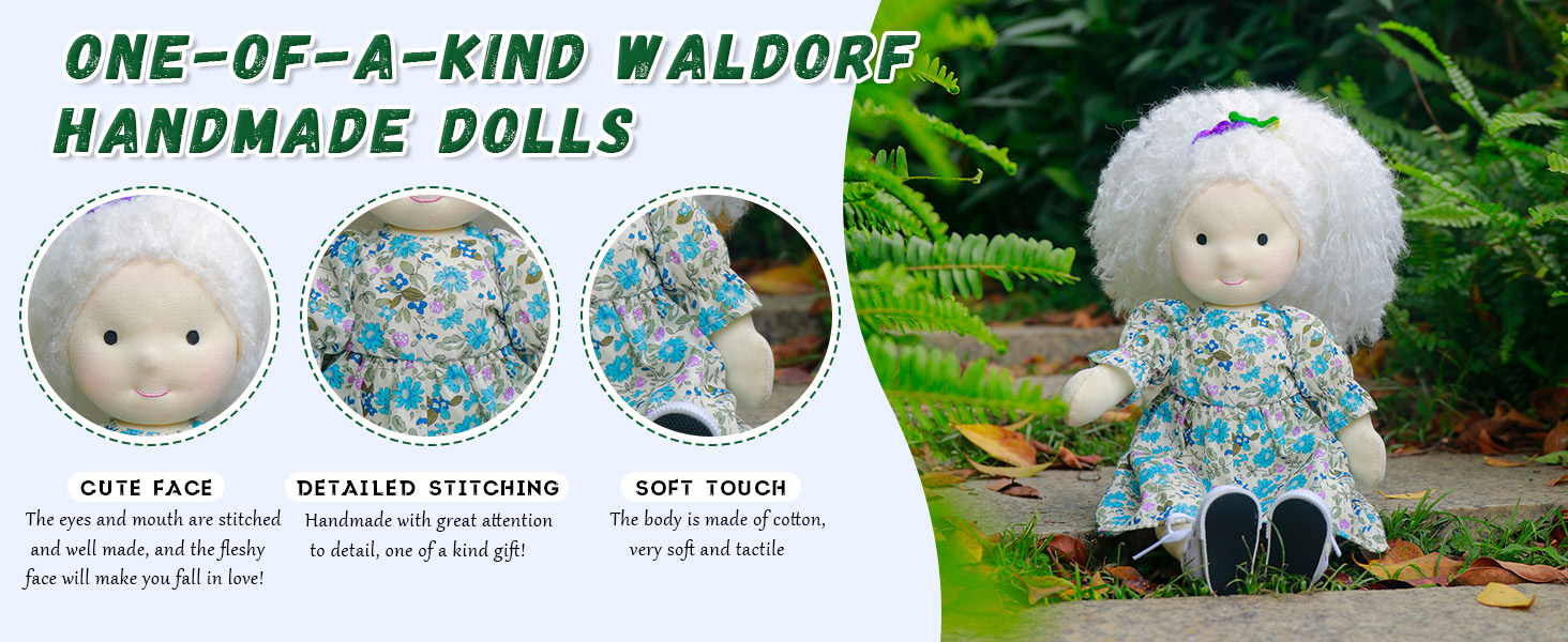 Waldorf dolls are typically made from natural materials such as cotton, wool, and wood, and are designed to have minimal facial features, allowing children to use their own imagination during play.